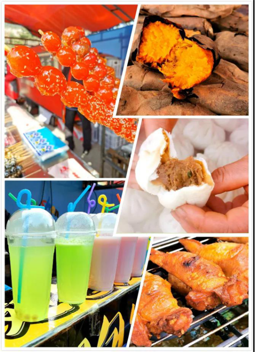 七星小镇街道两边汇集了全国各种风味特色小吃:烤面筋、烤串、粘牙糖、糖葫芦、棉花糖、臭豆腐、烤冷面、擀面皮......给我统统安排上!