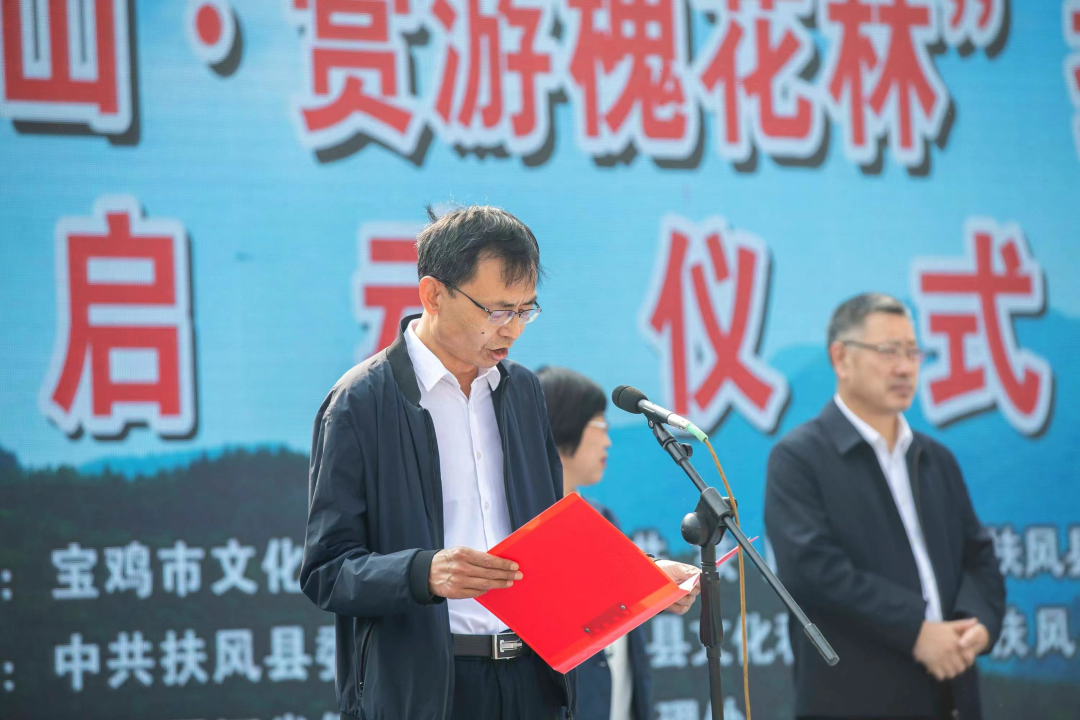 市文旅局局长周保君讲话。重点提到“野河山生态旅游景区以鲜明的生态旅游品牌在2020年被评定为国家4A级旅游景区。近年来精心设计了游贵妃故里、品盛唐文化、知西周传奇、观红色记忆、赏万亩槐林、享天然氧吧等旅游业态,让游人在这座秀美的清幽山峦感受到了浓厚的历史人文气息,也体验到了独特的槐花美味,已成为扶风提升旅游形象、对外宣传的一个靓丽名片。”